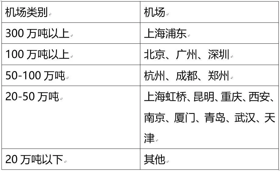 2019年貨郵吞吐量在20萬噸以上的共16個機場,吞吐量之和占全國總量的80%,是國家航空貨運發展的未來所在。各地機場按貨郵吞吐量大小可分為五類,如下表示: