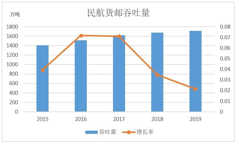 近五年航空貨郵吞吐量呈緩慢上升趨勢,2019年貨郵吞吐量達1700萬噸,增長率呈下降趨勢。