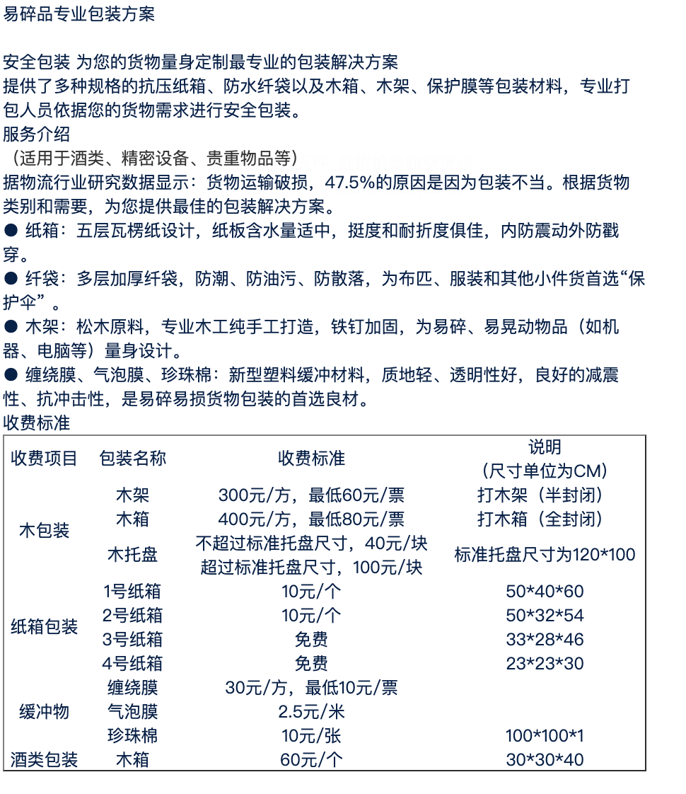 提供了多種規格的抗壓紙箱、防水纖袋以及木箱、木架、保護膜等包裝材料,專業打包人員依據您的貨物需求進行安全包裝。